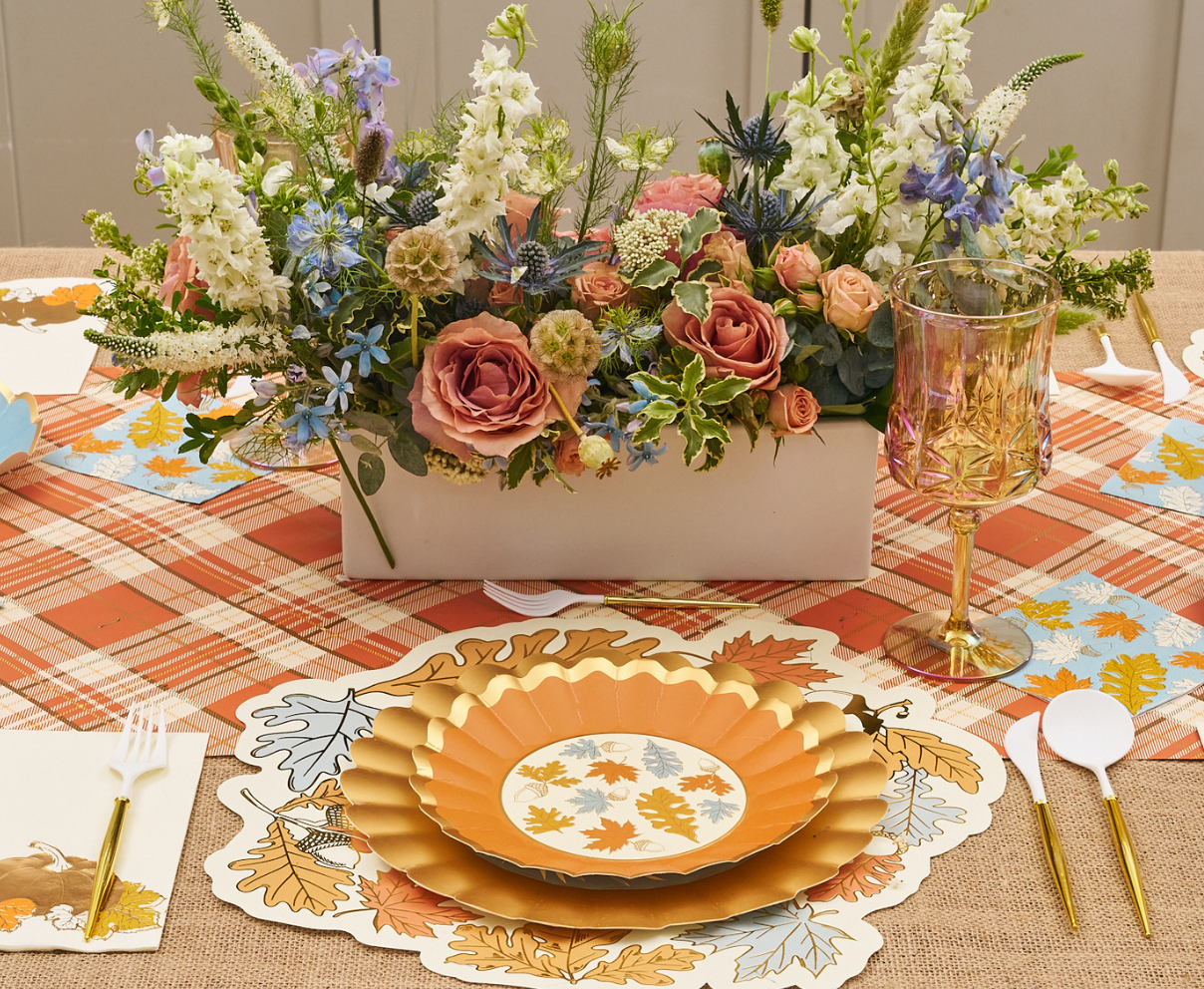 These scalloped-edge salad plates from our Gilded Harvest collection feature a delicate harvest leaf design with shimmering gold foil accents, making them a perfect complement to your autumn table setting. These plates are both durable and disposable, allowing you to skip the dirty dishes, without sacrificing quality and style. Your guests will never believe they’re disposable! • Quantity: 1 pack of 8 plates. • Material: Paper • Size: 8" round. Perfect for salads, side dishes, cake, and more!